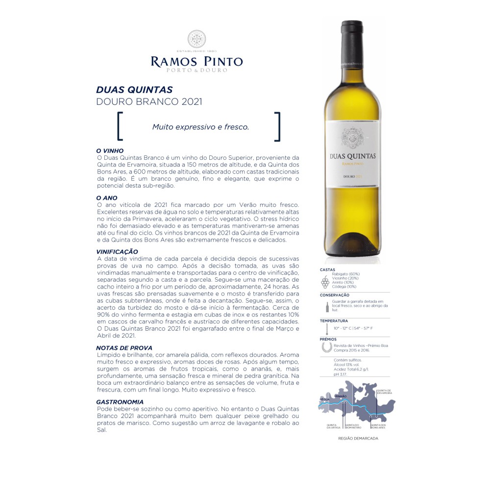 Sirva o Duas Quintas Branco bem gelado, entre 8°C e 10°C, para melhor apreciar suas nuances. Desfrute deste vinho versátil e equilibrado em momentos descontraídos e festivos, especialmente ao lado de pratos leves e aromáticos.